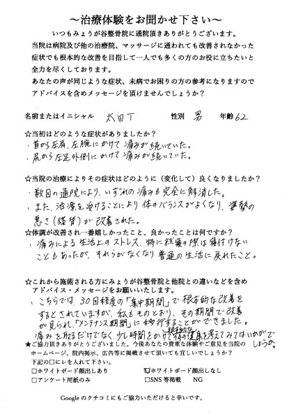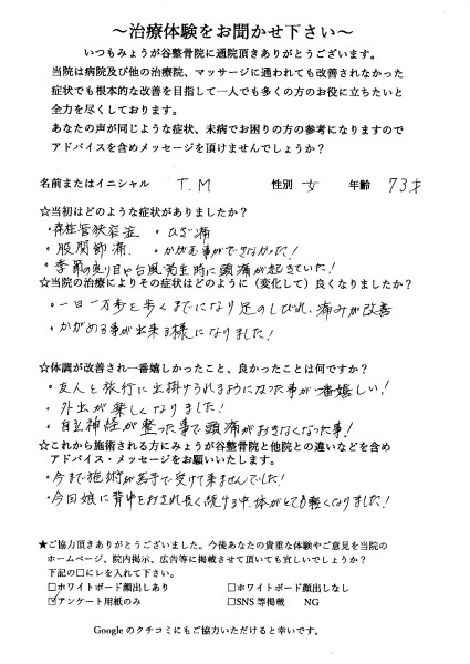 今後は予防医療、代替医療の一環としてみょうが谷整骨院で背骨をケアしていただきながら背骨の安定性、可動域を高める運動を継続していきたいと思っています。
